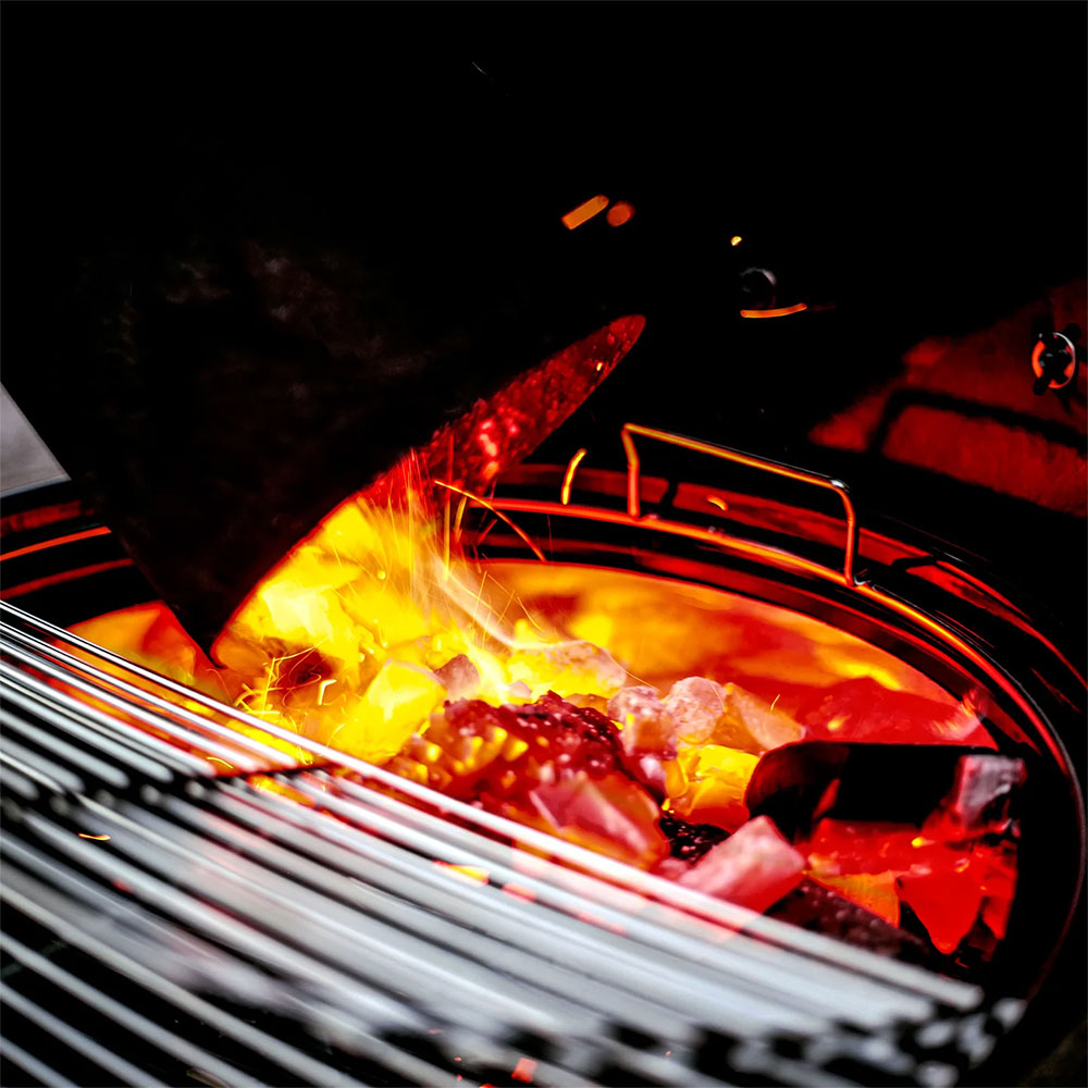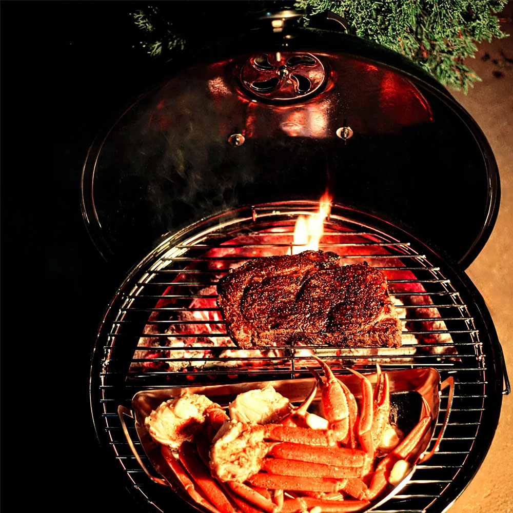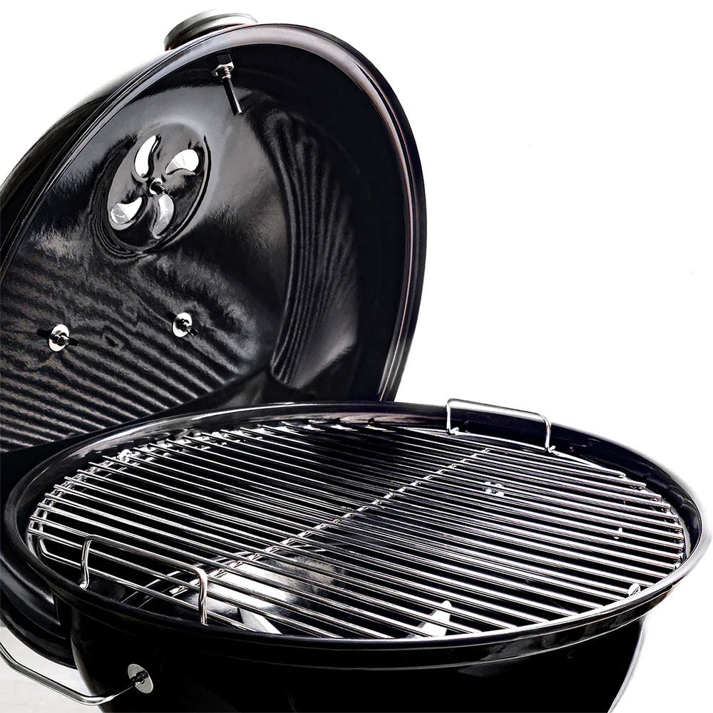 - Решётка EasySpin 47 см в комплекте, установленная на этот гриль, легко вращается вокруг своей оси и позволяет быстро переместить все продукты с огня в зону непрямого жара, чтобы они не подгорели. Большая откидная створка даёт более удобный доступ к углю в корзине или на решётке.